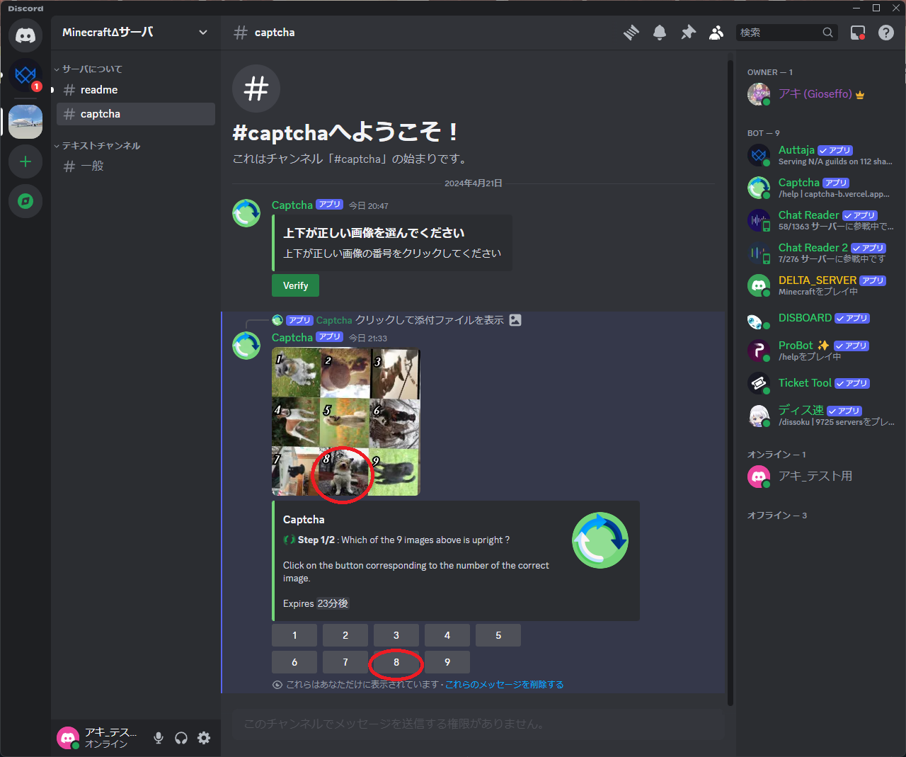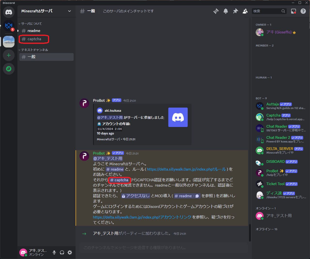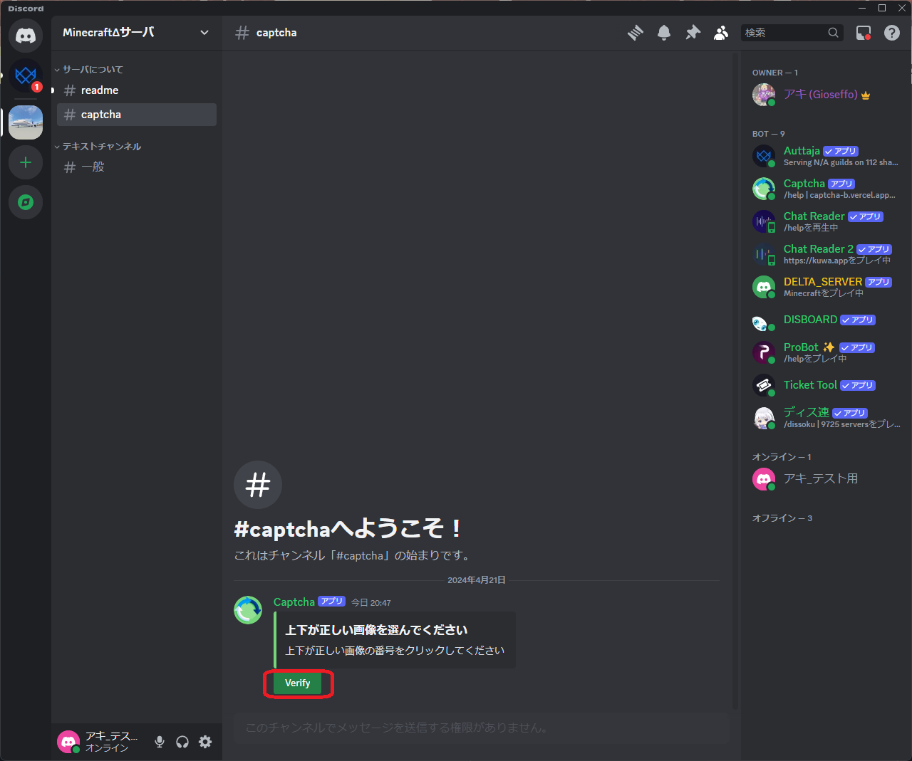 - サーバにJoinしたら、readme・一般・captchaチャンネルのみが見えており、発言できない状態です。